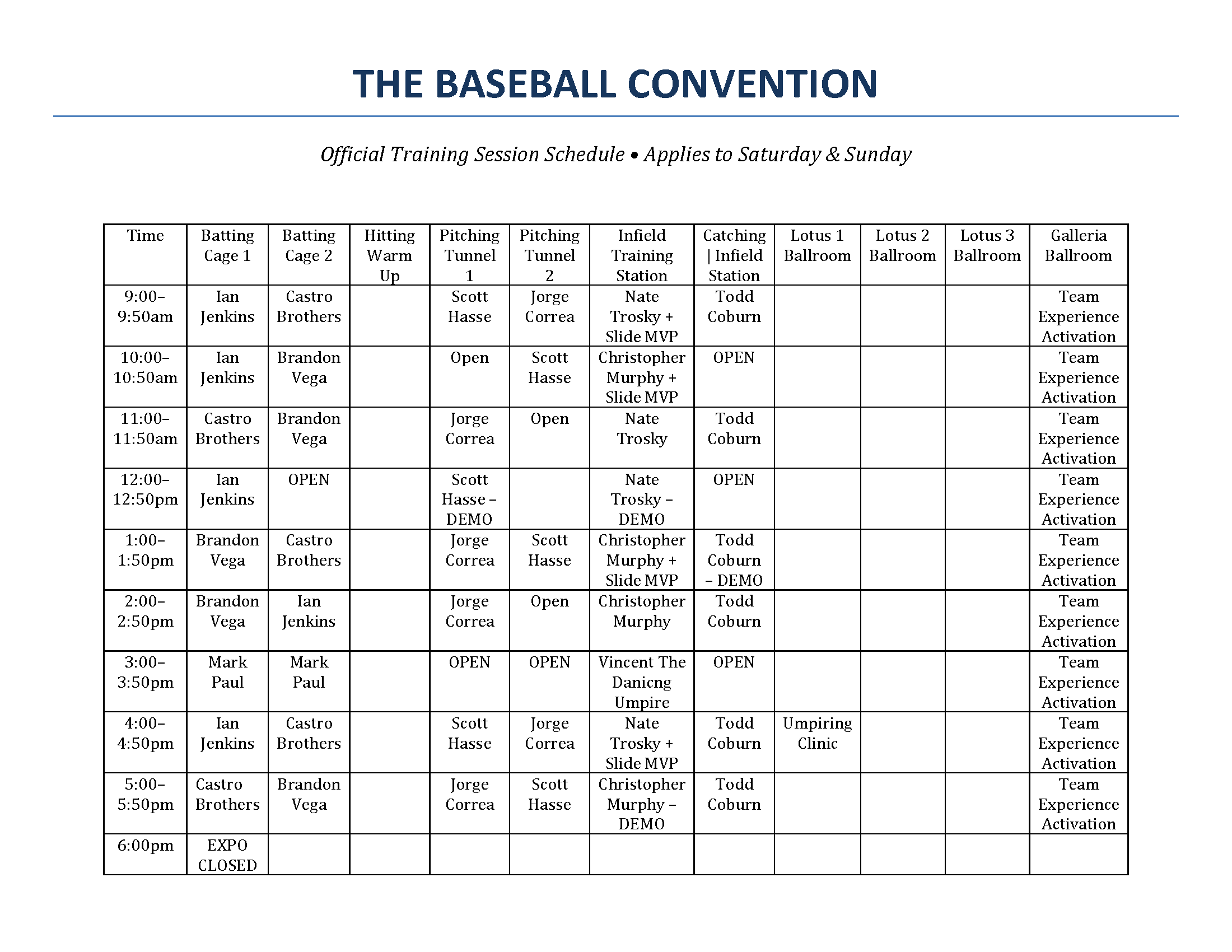 Official Training Session Schedule